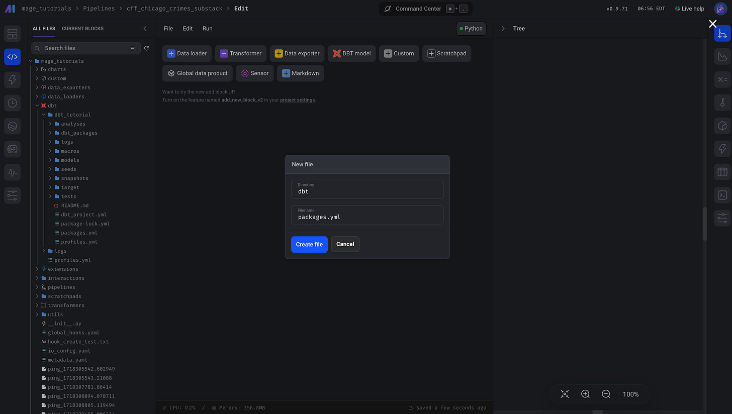 Generate a file called packages.yml from the popup menu and click Create file. After this you should see a packages.yml file populate in your dbt_tutorial folder.
